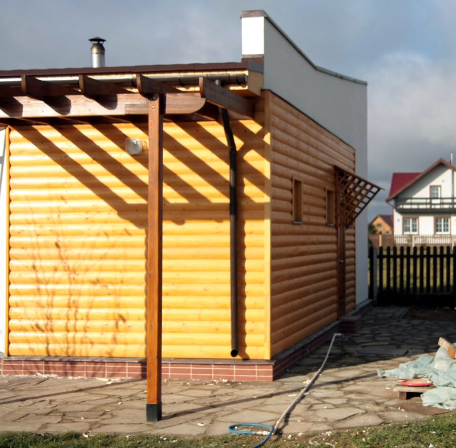 Покрытия- блокхауз, вагонка,структурная штукатурка , кровля -катепал, полы в моечной и парилке - липа. Зал , санблок, тамбур - ПВХ - плитка LG chemical на стяжке. Деревянные элементы обработаны покрытием belinka -сосна и дуб.