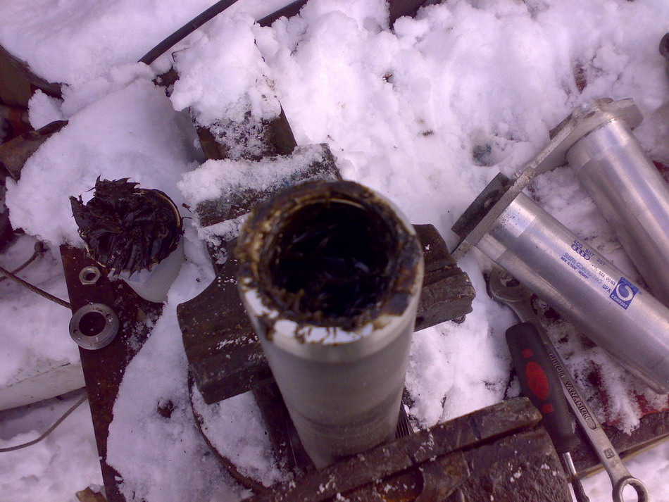Внутри цилиндра тоже самое, а поглубже сохранился гель, уж не знаю как его описать, что-то типа твердого желе, очень близко к мягкой резине. Возможно был мягче или ещё как устроено, видимо во время удара при прохождении через отверстия в поршне происходит нагрев и гель кристаллизуется…Поэтому демпфер и не выбивался обратно, вычищал всё проволокой и гвоздиком, вобщем молоток явно бы не справился.