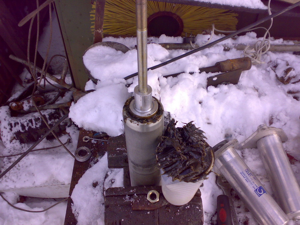 Поршень имеет кольцо разрезное на которое также давит гель через отверстия, видимо чтобы не дать возможность прохождения между кольцом и стенками цилиндра, и два сальника, внутренний на штоке и большой на крышке, всё из пластмассы. Вытащил из цилиндра остатки этой «стружки» и до половины остатки геля.
