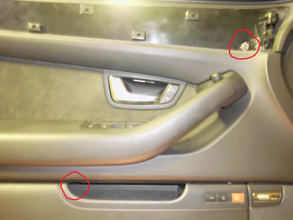 Снимаем резиновые заглушки 1, опускаем стекло, чтобы было видно его крепление, фиксируем,  освобождаем от электрической части 2(только проводка), динамик снимать НЕНАДО