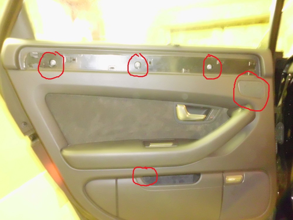 Болтиков немного больше чем в передней двери, 5 шт. Один прячется под декоративно зашитой динамика высоких чистот