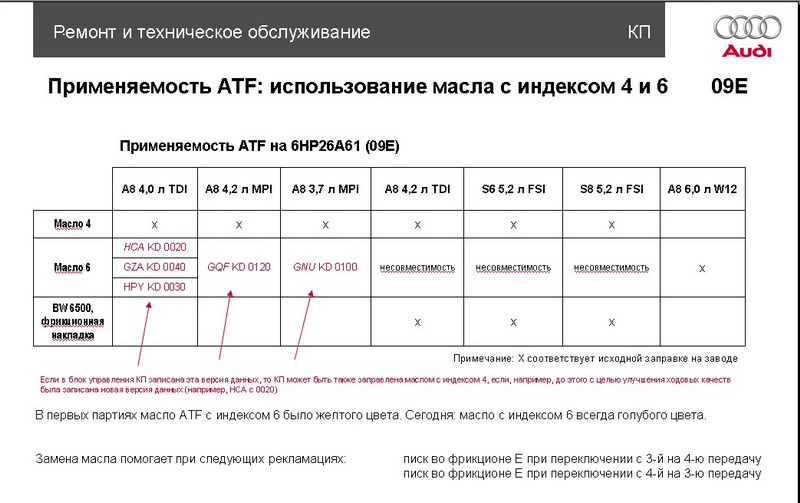 Интересно с февраля 2005 г. начали лить 055162 (с добавлением модификаторов трения) как я понимаю, оно должно было решить проблему с рывками 3-4 пер. (писк во фрикционе) и индекс вязкости (165) у него другой чем в 055005 (и.в. 151), но с марта 2008 г. появляется еще более оптимизированная жидкость 060162 (и.в. 151) у которой характеристики практически такие же как и у первоначальной 055005. Может смена жидкостей очередной не удавшийся эксперимент от Ауди! На коробках с движком 6.0 л. заливали 055162 и были проблемы с бубликом (малый ресурс) может все дело в модификаторах трения? На БМВ не зависимости от типа мотора и привода во все АКПП ZF 6 HP как начали заливать с конвейера Shell М-1375.4 и льют до сих пор! Ребята какие мысли?