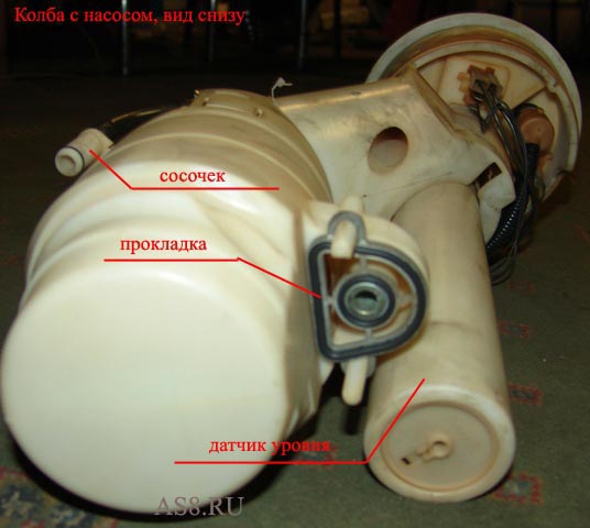 Колба с насосом вставляется в пластиковый накопитель, через специальную прокладку и привинчивается длинным болтом. Это соединение должно быть герметично, через него попадает топливо из накопителя в колбу. Заливная горловина бака расположена так, чтобы заливаемый бензин затекал в накопитель сверху. Толстые трубки правой части бака подают бензин в накопитель снизу, трубка левой части бака подает бензин в накопитель чуть выше. Через внутренние каналы в накопителе, бензин попадает в колбу. Туда же сверху подается бензин от обратки. Насос выбирает некоторое количество топлива из колбы, лишнее топливо из накопителя сливается в правую часть бака. Таким образом, поддерживается циркуляция топлива внутри бака, постоянное наполнение накопителя и колбы бензином. Даже при осушении левой заборной трубки топливо продолжает поступать справа.