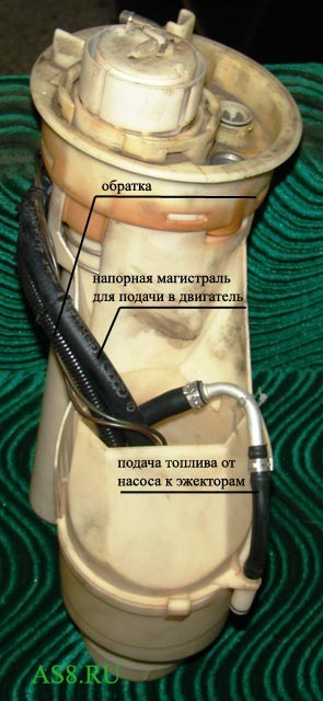Колба с насосом вставляется в пластиковый накопитель, через специальную прокладку и привинчивается длинным болтом. Это соединение должно быть герметично, через него попадает топливо из накопителя в колбу. Заливная горловина бака расположена так, чтобы заливаемый бензин затекал в накопитель сверху. Толстые трубки правой части бака подают бензин в накопитель снизу, трубка левой части бака подает бензин в накопитель чуть выше. Через внутренние каналы в накопителе, бензин попадает в колбу. Туда же сверху подается бензин от обратки. Насос выбирает некоторое количество топлива из колбы, лишнее топливо из накопителя сливается в правую часть бака. Таким образом, поддерживается циркуляция топлива внутри бака, постоянное наполнение накопителя и колбы бензином. Даже при осушении левой заборной трубки топливо продолжает поступать справа.