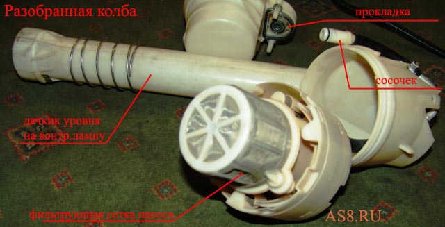 Колба с насосом вставляется в пластиковый накопитель, через специальную прокладку и привинчивается длинным болтом. Это соединение должно быть герметично, через него попадает топливо из накопителя в колбу. Заливная горловина бака расположена так, чтобы заливаемый бензин затекал в накопитель сверху. Толстые трубки правой части бака подают бензин в накопитель снизу, трубка левой части бака подает бензин в накопитель чуть выше. Через внутренние каналы в накопителе, бензин попадает в колбу. Туда же сверху подается бензин от обратки. Насос выбирает некоторое количество топлива из колбы, лишнее топливо из накопителя сливается в правую часть бака. Таким образом, поддерживается циркуляция топлива внутри бака, постоянное наполнение накопителя и колбы бензином. Даже при осушении левой заборной трубки топливо продолжает поступать справа.