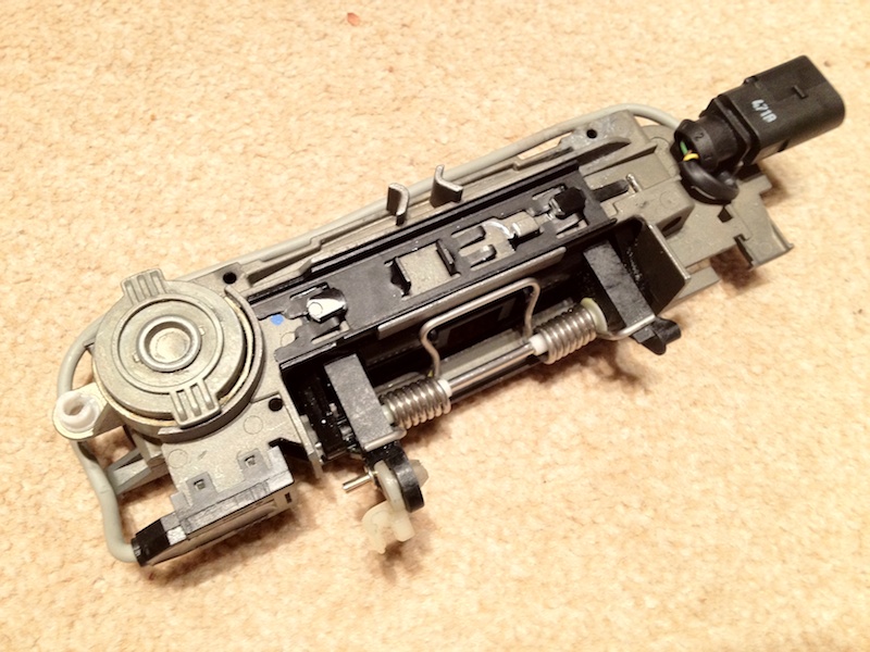 * Плохая новость: разобрав дверь я пронял, что моя внутренняя ручка не совместима с внешей ручкой A6 C6. У меня машина Февраль 2002. При этом на более поздние машине S8 Final Edition черного цвета, фотки которой были приведены в начале, те же самые внешние ручки A6 C6 были идеально совместимы с внутренними ручками.