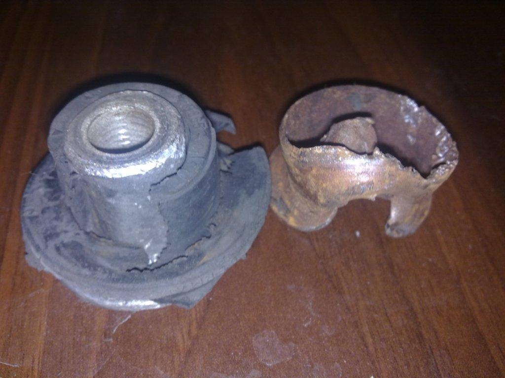 Вот, поменял сайлентблок корпуса ступицы. Решил рычаг не снимать, хотел для удобства снять тормозной диск и супорт, но прикипевшие болты отговорили меня от этой идеи. Короче, освободил косточки, поддамкратил рычаг и с легкостью вывтащил резинки сайлентблока. ПРОБЛЕМА была в посадочных кольцах сайленблоков - они намертво засели . часа полтора ковырял зубилом и все таки вытащил. Далее начал забивать сайлент к которому был свободный доступ со соторы рычага в чем и была моя ошибка, так как второй сайленблок никак не хотел садиться на свое место. сделал стяжку между сайлентами из болта и гаек- 5ть болтов сломал пока его затянул на свое место. С другой стороны все сделаю иначе: сначала затяну стяжкой сайлент который повернут к ступице, и упор сделаю на сталной корпус, потом второй можно легко заколотить на свое место. Внизу фото снятых сайлентов: резинки разбиты в пух, даже на посадочном кольце сайлента выработка есть (рис.1).