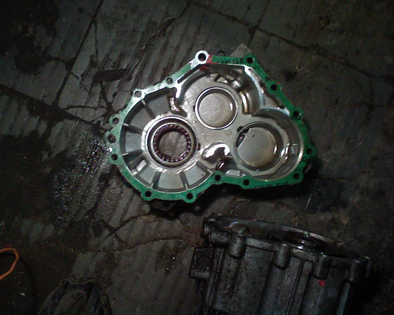 А теперь обращаем внимание на ту половину, которую мы сняли для того, чтобы увидеть эти шестерни. В ней имеется сальник, отделяющий масло АКПП от масла межосевоо дифференциала. В этот сальник входит верхняя шестерня с предыдущих фотографий.