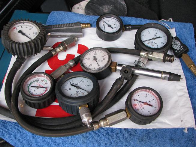 Всевозможные приблуды для измерения компрессии, давления масла, давления топлива, вакуума, давления в шинах и пистолета для накачки шин.