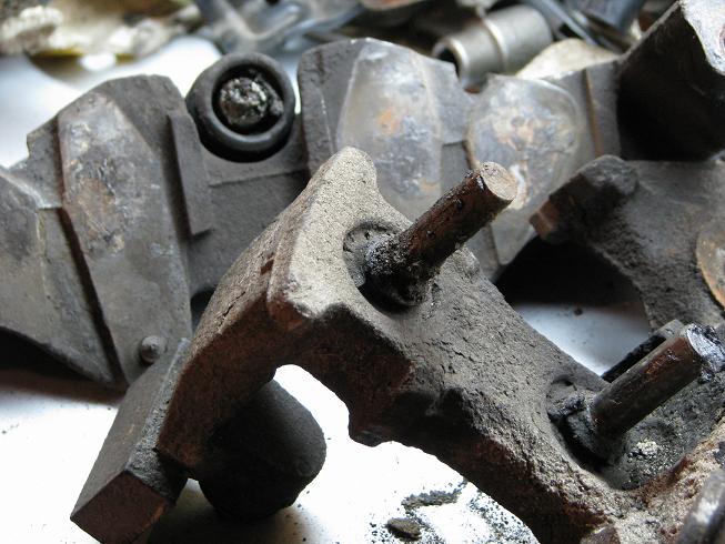 Стоп, одна латунная втулка присутствует, совершенно без следов износа, а где вторая? Здесь кто-то был! Пыльники поршней целы, хотя вид у них потрепанный. Рвем пыльник поршня и ... откуда это?
