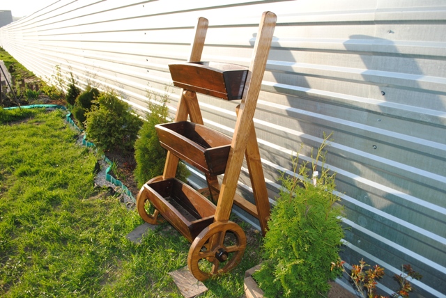 Родители моей жены работают на производстве столярных изделий,а мой тесть собственно помешан на них.В свободное время делает разные интересные изделия,причем на мой взгляд очень кропотливо и качественно.И у него есть возможность иногда подхалтурить.Так что если что кому интересно и хочет приукрасить свой дом или дачу могу помочь с этим.В основном все делает тесть,я ему только помогаю. если что то крупное.типа беседок,будок или т.п.Если конечно надо,то можно и в промышленных масштабах у них официально на предприятии,а так мелко серийно не заказ,все что угодно.Вот я прилагаю немного фоток со своего участка.Кому интересно можно ко мне приехать в живую посмотреть пощупать..О цене могу сказать только одно,на порядок дешевле чем официально стоят.Могу дать телефон тещи,она этим рулит.Вот допустим цветочница,сейчас тесть сделал еще одну,более похожую на типичную тележку.