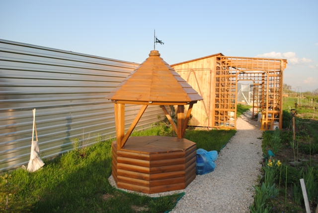 Вот допустим декоративный колодец над кранами подачи воды на участок.и маленький сарайчик для хозинвентаря с решетками для плетущихся растений.