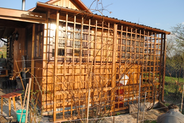Вот допустим декоративный колодец над кранами подачи воды на участок.и маленький сарайчик для хозинвентаря с решетками для плетущихся растений.