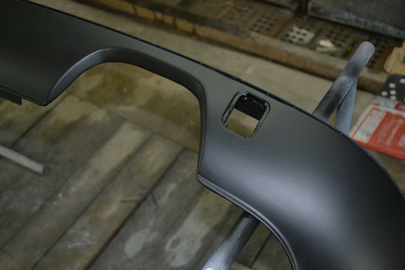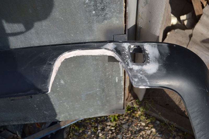Далее выпелил вырез под выхлоп.Бортик решил вылепить из шпатлёвки со стеклотканью,но для этого надо было создать форму куда наносить шпатлёвку.Использовал монтажную пену,нанёс на край выреза,когда высохла обрезал лишнее и на неё накладывал шпатлю (фото этого процесса сделать забыл).Вот уже почти законченный результат,ещё немного шпатли и в покраску :)