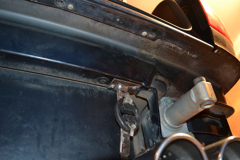 Посмотрев фотки у других людей делавших разводку на две стороны понял,что вырез под вторую трубу попадает на лючёк для буксировочного "крюка".Решил что нужно сместить лючёк в сторону и соответственно и переделать само крепление буксировки.
