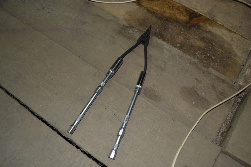 и сразу занялся съёмом дальнего хомута пыльника рейки.Но он распологался дальше(глубже) чем с левой стороны.Пришлось нарастить съёмник для стопорных колец вот таким способом