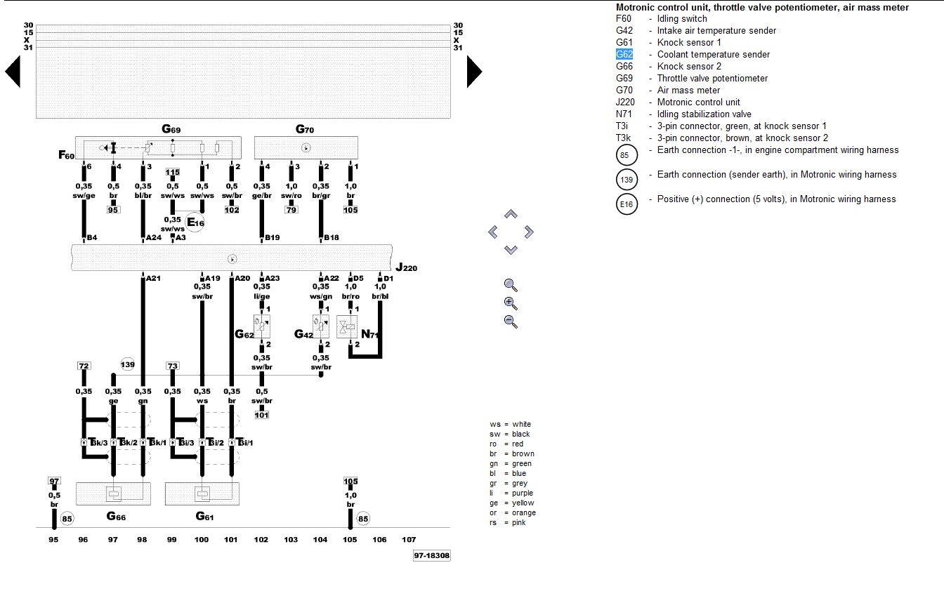 Нифига не получаетя найти, в электрике я почти ноль, да и технический английский не лучше. Нужно прозвонить проводку от датчика температуры ОЖ G62. Насколько я знаю, проводка идет прямиком на мозги двигла.