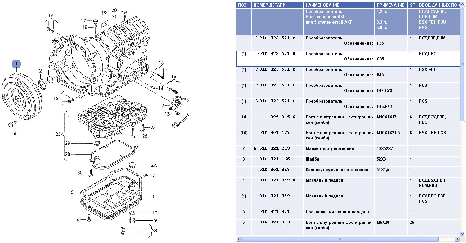 Решение проблемы. Для начала решил поменять масло, однако проблема оставалась. Было принято решение, что надо разбирать АКПП и искать причину. Когда коробка была снята и разобрана, были тщательно просмотрены все элементы, после чего особых признаков указывающих на причину удара при переходе с 5 на 4 передачу или более низшую, которая больше всего беспокоила, особенно то не было выявлено. Единственное что раз уже коробка была разобрана, то для уверенности решил восстановить гидротрансформатор символ Q35, обозначен на рис. гидротрансформатор поз.1, также были заменены все резинки и уплотнители, а также произведена замена поршня муфты заднего хода на рис. ZF 5HP24A поз.28, на рис. из программы ETKA указана муфта заднего хода с элементами - поз.5. Коробку собрал и поставил назад, поменяв фильтр и залив новое масло. Однако причина № 2 не исчезла, а по причине № 1 немного мягче стала включаться задняя передача, но не существенно. В общем, головоломка вместе с ремонтными работами и поиском причины длилась неделю. После всяческих проверок электроники и гидравлики пришла мысль по поводу неправильной работы блока клапанов, рис. из программы ETKA рис. блок клапанов поз.25. Решил его снять и перебрать, однако результата не дало. В дальнейшем поиске решения проблемы для полного исключения блока клапанов нашел б/у, но правда от авто с 98 года. Поставил этот блок клапанов и вот какая ерунда получилась: пришлось перекинуть проводку со своего блока клапанов, так как разводка на фишке отличалась от моей т.е блок клапанов до рестайла 99’ и после 99’ не взаимозаменяемы, глюки совсем другие начали проявляться, что и окончательно навело на мысль замены блока клапанов. После замены блока клапанов на новый так как б/у нельзя было найти да и рисковать не хотелось с б/у, а также вышеупомянутых работ результат был на лицо. Теперь АКПП работает просто безупречно, удары при переходе с 5 на 4 передачу или более низшую пропали, толчки при переходе на R и D также исчезли. Все передачи переключает очень плавно. Вот такая вот история