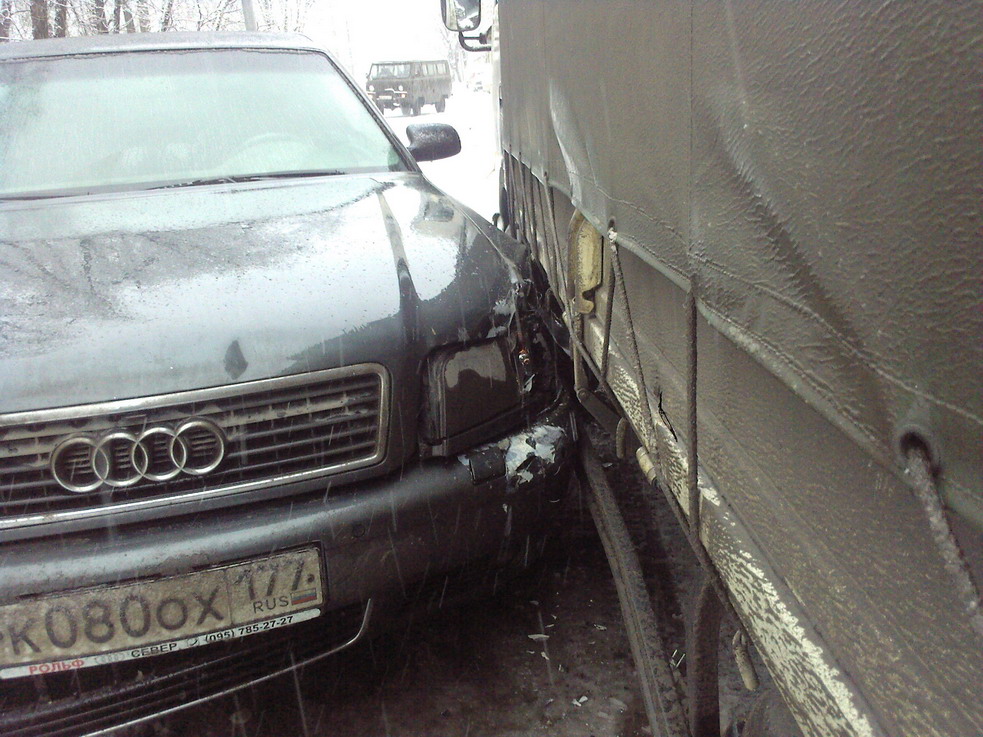Ну, про фуру, конечно шутка, и на самом деле совсем не смешно. Вывод: не шутите с АБС. Это было вчера. (москвичи должны помнить вчерашний проклятый снегопад), место такое, где двум машинам никак не разъехаться. Фотки ниже - результат моей глупости (я сам от себя офигевал полдня потом), АБС и ЕСП - неисправны, собирался заняться ими на выходных, снега - навалом. Резина - всесезонка... идиот, короче! Первая в жизни авария, которую сотворил... да и то, женская, блин какая-то... утешаю себя одним - именно такой удар - это мой выбор, я посчитал, что это лучше, чем на заносе влететь своим боком прямо в лоб к грузовику, как должно было случиться изначально, кое-как выпрямился, свернул, но не успел, машина двигалась "змейкой". По касательной зацепился за крюки, торчащие обычно по бокам у таких ISUZU, ему - хоть бы хны, а мне - весь алюминий буквально порвало этим крюком, т.к. удар был не сильный, я вообще, выходя из машины думал, что обойдётся небольшой вмятиной... но нет... и правильно, по делом мне... ИДИОТ