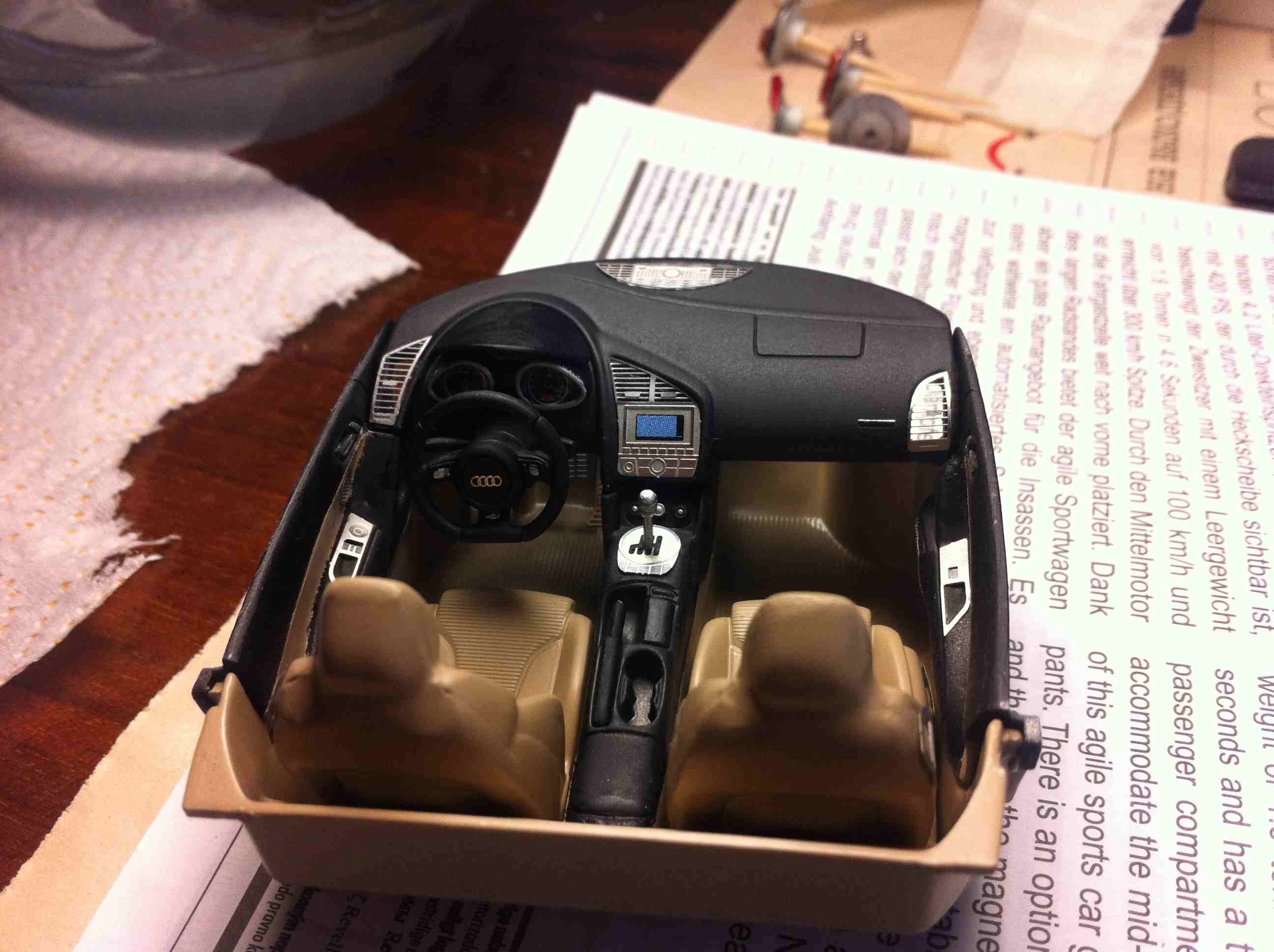 Салон, пока тоже не финал (несколько раз перекрашивалась зона подлокотников; сложно в несколько "смежных" цветов красить одну деталь). Все пластиковые решетки выпилены и заменены на травление, то же в отношении рычага и накладки КПП, педалей, кнопок и эмблемы на руле. Цвет салона - по фоткам из Инета.