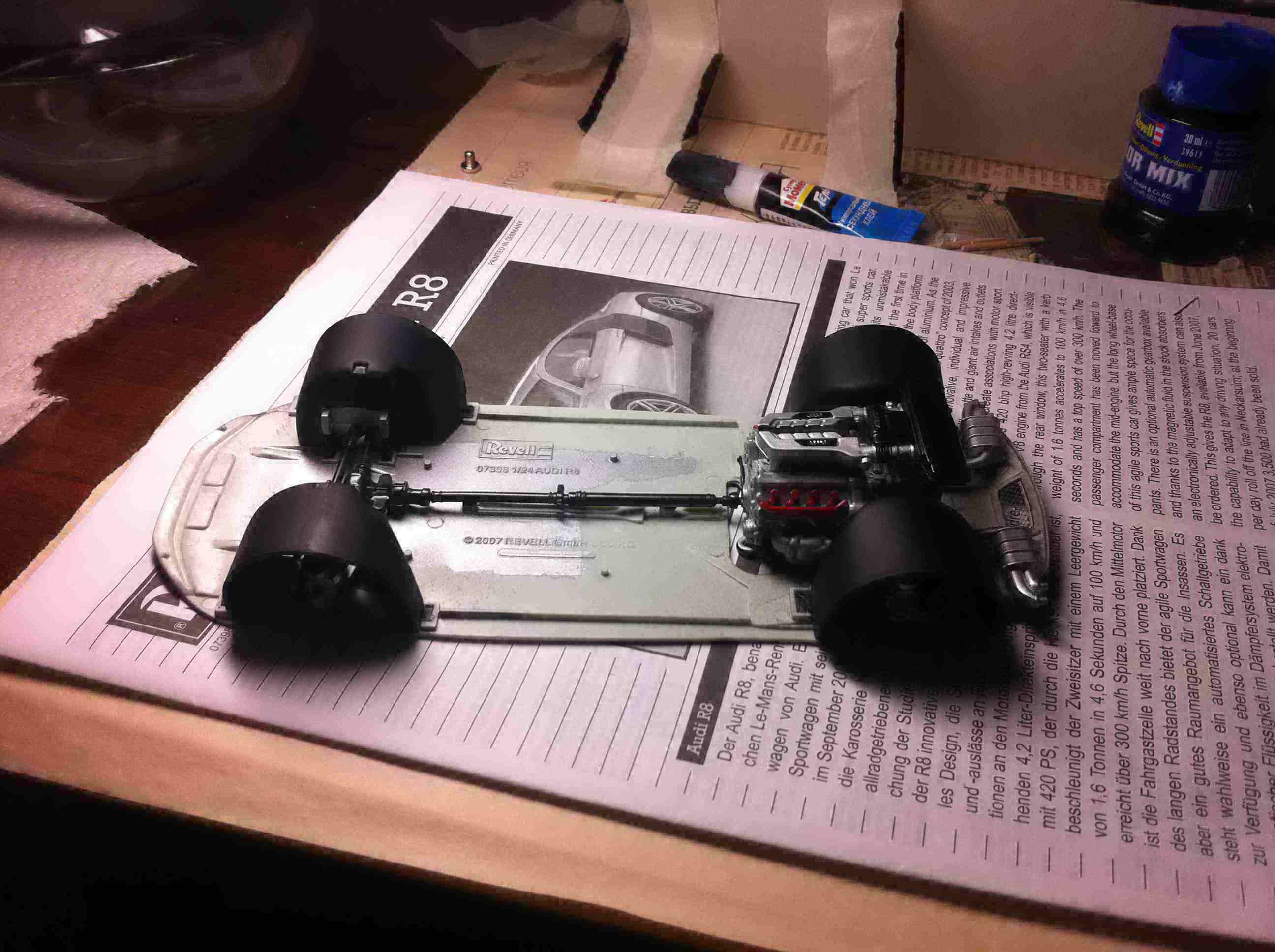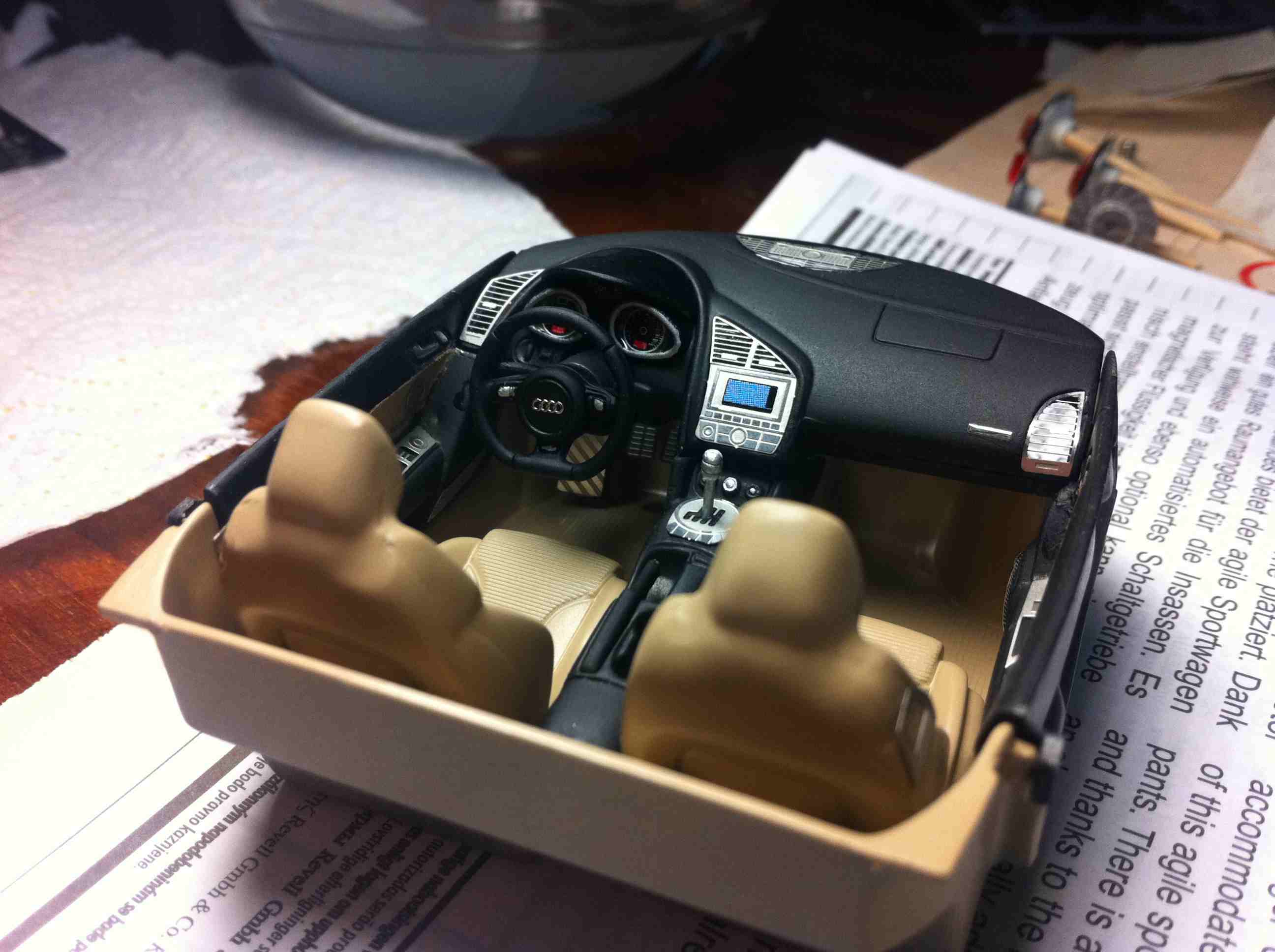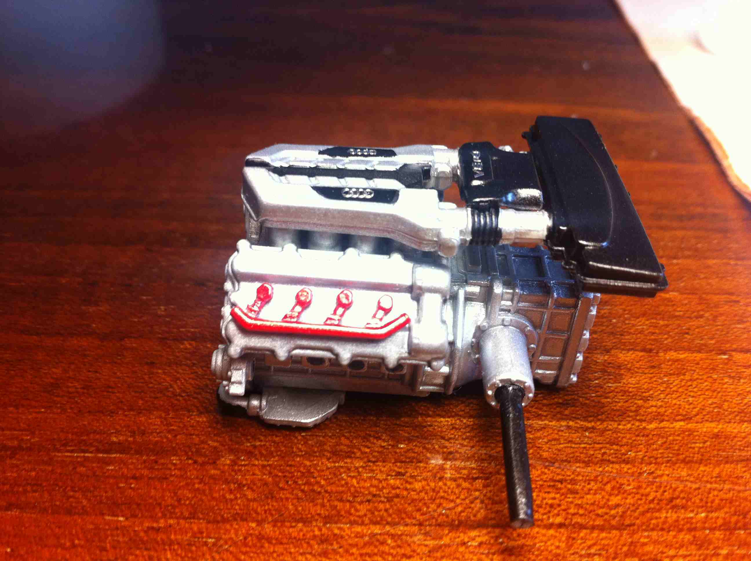 Просто оговорюсь (для тех, кто не сталкивался), комплектик - это набор деталек из серого пластика, количеством в районе сотни (для этой модели окло 100, точно не помню, один двигатель, которого тут не видно, почти из 2-х десятков деталей и красится в 3 цвета:) ). На самом деле, в моделе много косяков (моих), т.к. талант пропить сложно, а навык - можно. Ну и красил руками (кистями 5-ти размеров). Покрашено в 12 слоев (наложил - отполировал, наложил - отполировал и т.д.; краска смешена из 4-х цветов, дабы получить алый Феррари; для его получения есть и более простые пути, но я-то "жил" еще прошлым представлением об инструментарии), покрыто лаком в 6 слоев (тоже кистью), обклеено декалями из набора. Ничего не отрезал, не добавлял (об этом - позже), да и сам процесс не документировал.
