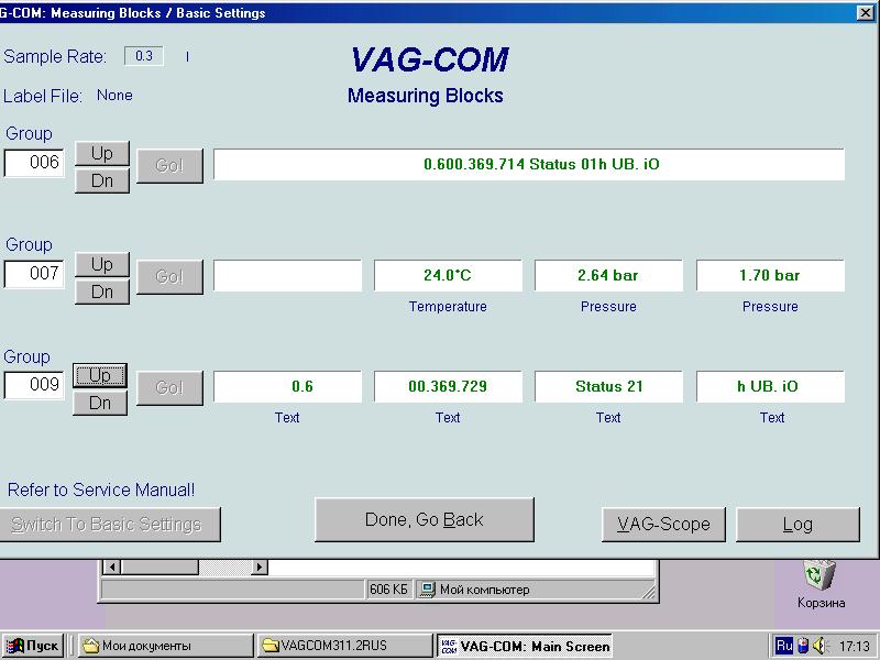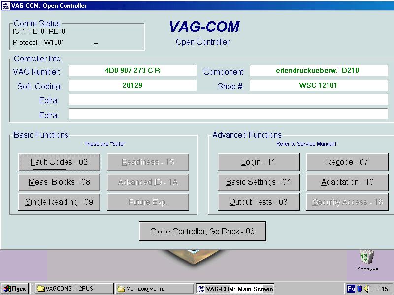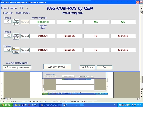 Далее начинаю процедуру програмирования системы контроля за давлением в соответствии с мануалом и система принимает текущее давление в шинах!!! параллельно наблюдаю за этим в ВАГКОМе. Циферки бегают,изменяются,сигналы поступают,фиксируются. Делаю тест системы через 17-й канал в адаптации(10). Система тестируется,значек о невозможности принять текущее значения давления НЕ ЗАГОРАЕТСЯ!!!