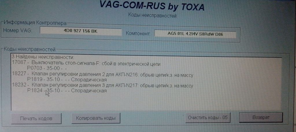 Поискал поиском,понял что таким кодом ошибки можно пренебречь и скинуть ее. Но засада в том, что проедешь 30 мин в пробке мотор и коробас хорошенько прогреются и все, бум внизу и в аварию АКПП. По Ваг-кому температура масла +98 градусов. И перезапуск не помогает,пока не проедешь на скорости 70км/час в аварийном режиме и температура не спадет до +84градусов, и можно перезапустить и будет нормально работать АКПП.