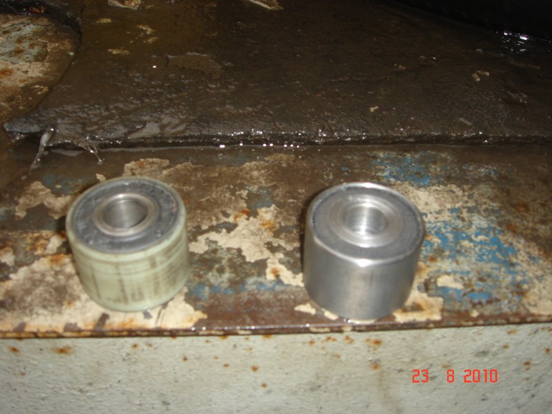 Сначала направили сайлент в место запрессовки балона, нам надо было добиться,чтобы он не шел наперекос. затем подкладывали шайбы разной толшины между сайлентом и стаканом, который находиться в пневмобалоне,затем на сколько хватало резьбы заворачивали этот стакан,он в свою очередь давил на шайбу а шайба на сайлент. Так до тех пор пока сайлент не запрессовался примерно на 1/4 . Потом до конца прессовали на прессе.