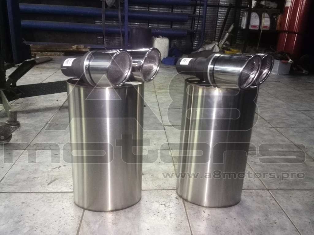 U24Y48063\52-M90SA : банка овал, каера один вход на 63 трубе, два выхода на 52 трубе с установленными насадками 90мм скошенные с сеткой внутри.