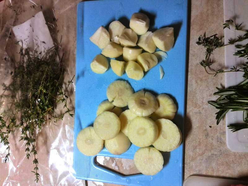 Берем чеснок, я очень люблю однодольковой (или как он там правильно называется), половину режем на дольки, половину вдоль, чтобы кружки получились.