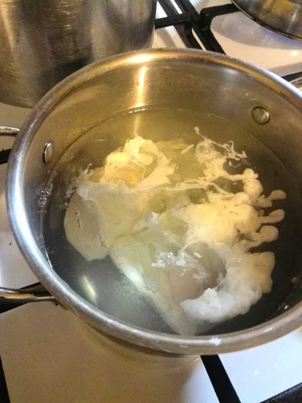 Делаем с яйцами хитрую штуку - в кипящую воду добавляем уксус (одна столовая ложка на литр примерно) и аккуратно разбиваем в воду яйца (я пролюбил один момент, надо было сначала яйца положить в кипяток, буквально на 5 секунд, они тогда сильно не расплываются, но не суть)