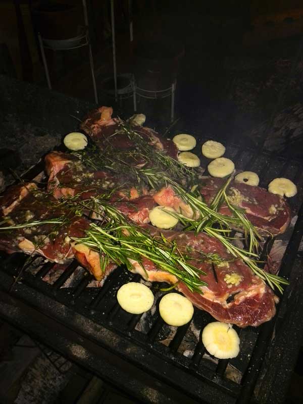 Тут все просто мясо на решетку, угли максимальные, чеснок кружками туда же, сверху мяса можно положить розмарин и темьян, которым его натирали.