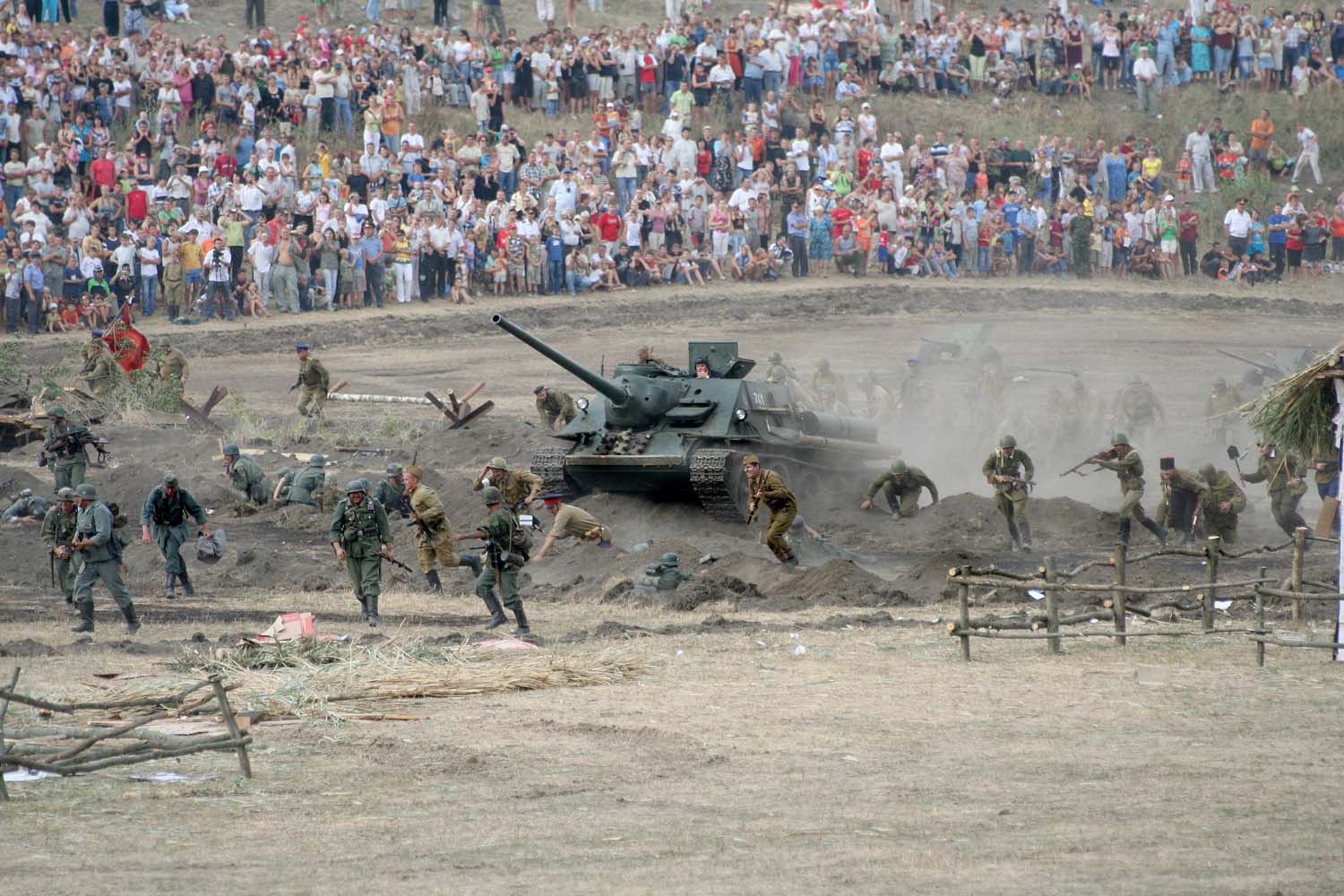 в честь годовщины освобождения родного города Таганрога была устроена реконструкция освободительной битвы, имевшей место в этих местах 65 лет назад - танки немецкие, самоходка русская, немецкие солдаты и красноармейцы, казаки на конях..ружья и пушки , автоматы, сабли и лопатки у казаков. Учебные самолеты со звездами демонстрировали превосходство над учебным самолетом с крестом, знать немецко-фашистским, был даже парашютист со со сбитого немецкого самолета.