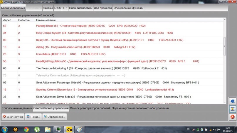 Приветствую уважаемые! После очень большого ремонта (акпп,раздатки,снятие двс,и замены сд-ченджера) odis выдает такую информацию,подскажите с чего стоит начать?!Автомобиль(A8l 2005 года мотор 4,2 bfm,quattro,keyless,) не работает очень много всего:горит давление масла(механически проверенно манометром все в норме),постоянно при включении зажигании работают оба вентилятора,пневмоподвеска не накачивается вообще(принудительно работает), мми выезжает пытается загрузить и через пять секунд обратно заезжает,кнопки подсветки мми не светяться. Кабель vas5054a только вчера подключили,особо в программе пока не разобрался,но вот что показывает: