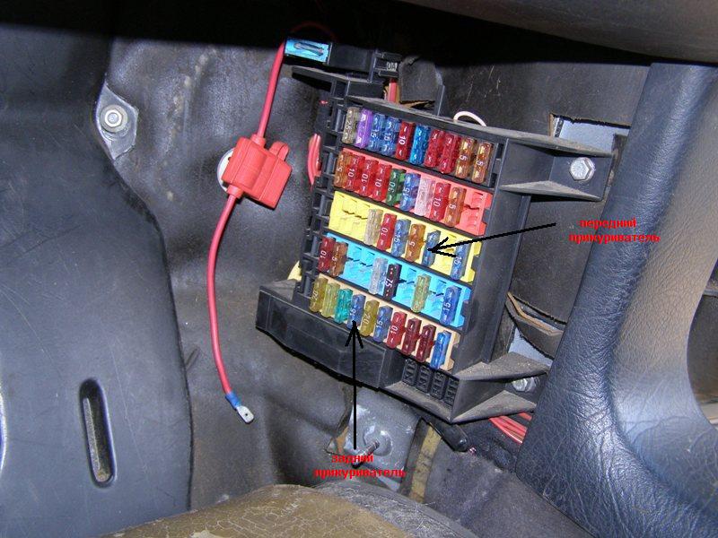 Блок предохранителей находится под кожухом справа в ногах переднего пассажира. Предохранитель на передний прикуриватель находится в желтом блоке, предохранитель на задний прикуриватель находится в коричневом блоке. См. фото.