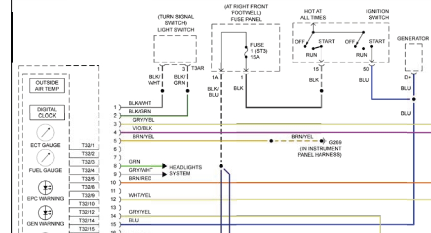 Тонкий синий проводок на генераторе. На нем должен появляться + при включении зажигания. Ток на него поступает от реле бензонасоса.