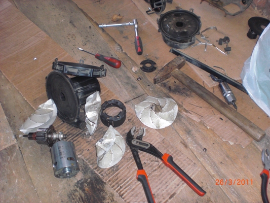 о чем это я... ах, ну да, разбираем насос... Когда крышка была снята, я увидел собственно турбину, причем даже две... от ихнего вида мне стало грустно, т.к. цена насоса сразу стала казаться более обоснованной:-). Турбины были люминиевыми, очень тонкими и легкими. Снятие их с вала неповрежденными представлялось крайне маловероятным:-)), никакими съемниками цепляться незачто.(с)