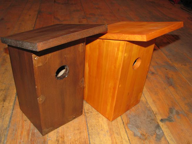 Несложный процесс распиловки, вкручивания саморезов, морилки и лакировки, и два пахнущих свежим лаком домика для птиц готовы.