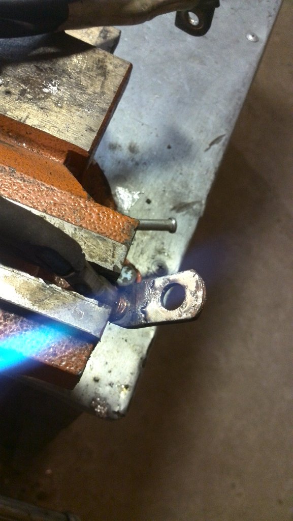 отмеряем, отрезаем, в клемму наливаем немного паяльной кислоты, вставляем кг в клемму и разогревая газовой горелкой добавляем туда припой пока он через край не закапает. Потом когда немножко остыл - приплющиваем молотком.