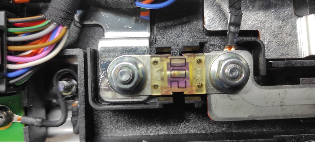 Батарея снята: Собственно, сами пластины батареи: Встроенный блок управления батареи: Предохранитель на 200А Аварийное реле размыкания