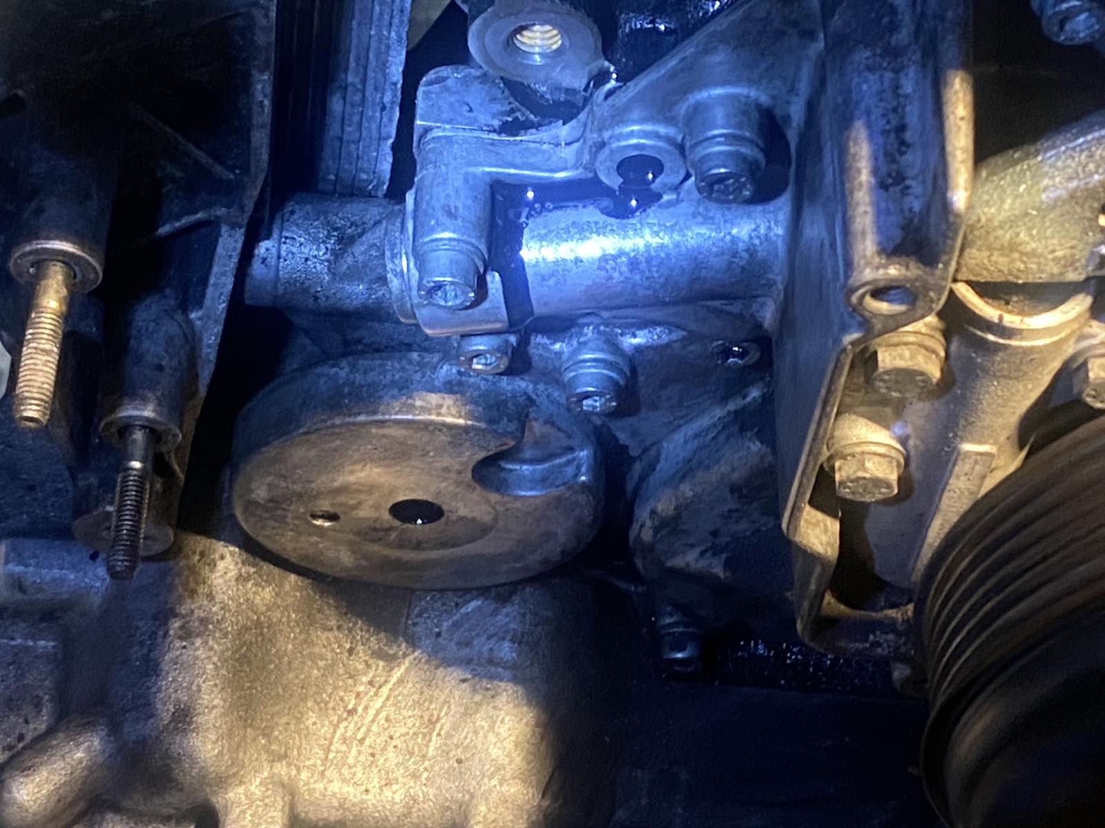 При ближайшем рассмотрении выяснилось, что течь происходит в районе чуть выше крепления натяжного ролика ручейкового ремня из под прокладки между блоком цилиндров и передней крышкой. Поджатие болтов, которыми крепится крышка, ничего не дало.