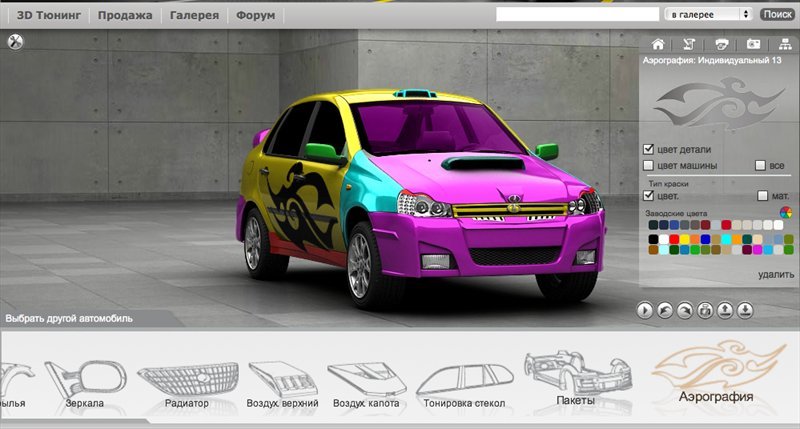 Нашел в интернете оч прикольный сайт, где можно в режиме онлайн и полноразмерном тюнинговать и преображать разных марок автомобили! В качестве инструмента использованы стандартные опции на подобии NFS , чуть беднее только. Но графика поражает своей реалистичностью! И затягивает своим процессом! В общем всем советую посетить данный сайт. А тех у кого что-нибудь интересное получилось - выкладывайте сюда