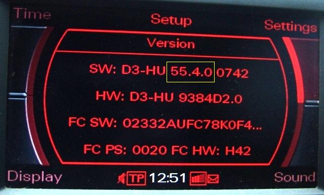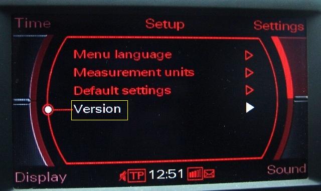 Для включения вкладки войти в CAR, затем Setup, затем Settings (Установки), затем Version (Версия). Таким образом выясняем текущую версию MMI и готовим соответствующие диски для обновления. Строго запрещено проводить обновление в неправильной последовательности или с пропуском соответствующих дисков.