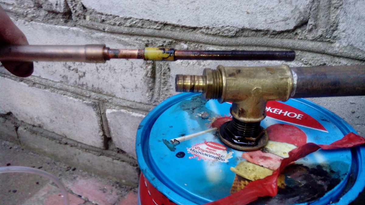 Итак, берем банку и внизу просверливаем отверстие ф8мм. Через это отверстие будет производится поджиг щепы и подсос воздуха. В крышке тоже делаем отверстие подходящим диаметром под хрень (#12) и плотно фиксируем ее на крышке. Далее на хрень накручиваем тройник мама-мама-мама и в один его конец вкручиваем штуцер, а во второй - сгон. В штуцер вставляется медная трубка на глубину так, что бы её конец оказался на уровне