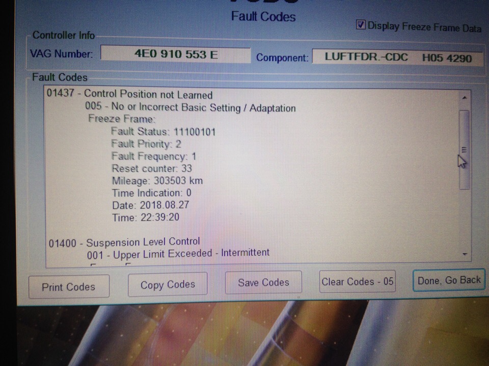 Решил провести адаптацию пневмы, предпосылок не было, чисто профилактически. До этого ошибок по пневме не было. Загнал на подземный паркинг, всё по инструкции (делал много раз, знаю что и как), но не тут то было. Ввожу первый канал, машина начинает опускаться, ниже, ещё ниже, уже просто на коленях лежит, а на ММИ всё стрелочка продолжает гореть что машина идёт вниз, хотя она уже и так лежит. Поднимать не начинает и не пытается. Стрелка вниз ещё горит. Через минуту-полторы ошибка, желтая и зелёная машина, ошибка. Пробую повторно. Машина и так уже лежит, запускаю первый канал - стрелка вниз и она опять около минуты пытается опустить и так лежащую машину. Ошибка. Пробую завести, поднять в лифт. Запускаю адаптацию, первый канал. Опускается, уже лежит на отбойниках наверное, стрелка вниз продолжает гореть, и ошибка. Два часа промудохался, ни разу не удалось адаптировать. Открывал канал с уровнями всех колёс (в мм), качал каждую сторону, все датчики чётко срабатывают, поднимал в лифт и опускал в динамик - все чётко отсчитывают миллиметры. Компрессор качает как надо, написано было ~13 бар. Что ей нужно? Раньше с первого раза удавалось. Да, и ещё заметил не так давно, что раньше машина опускалась быстрее в динамик. А сейчас перед быстро, а зад еле - еле.